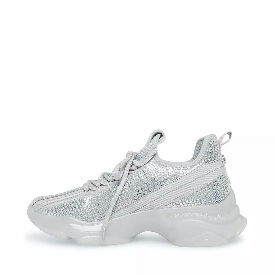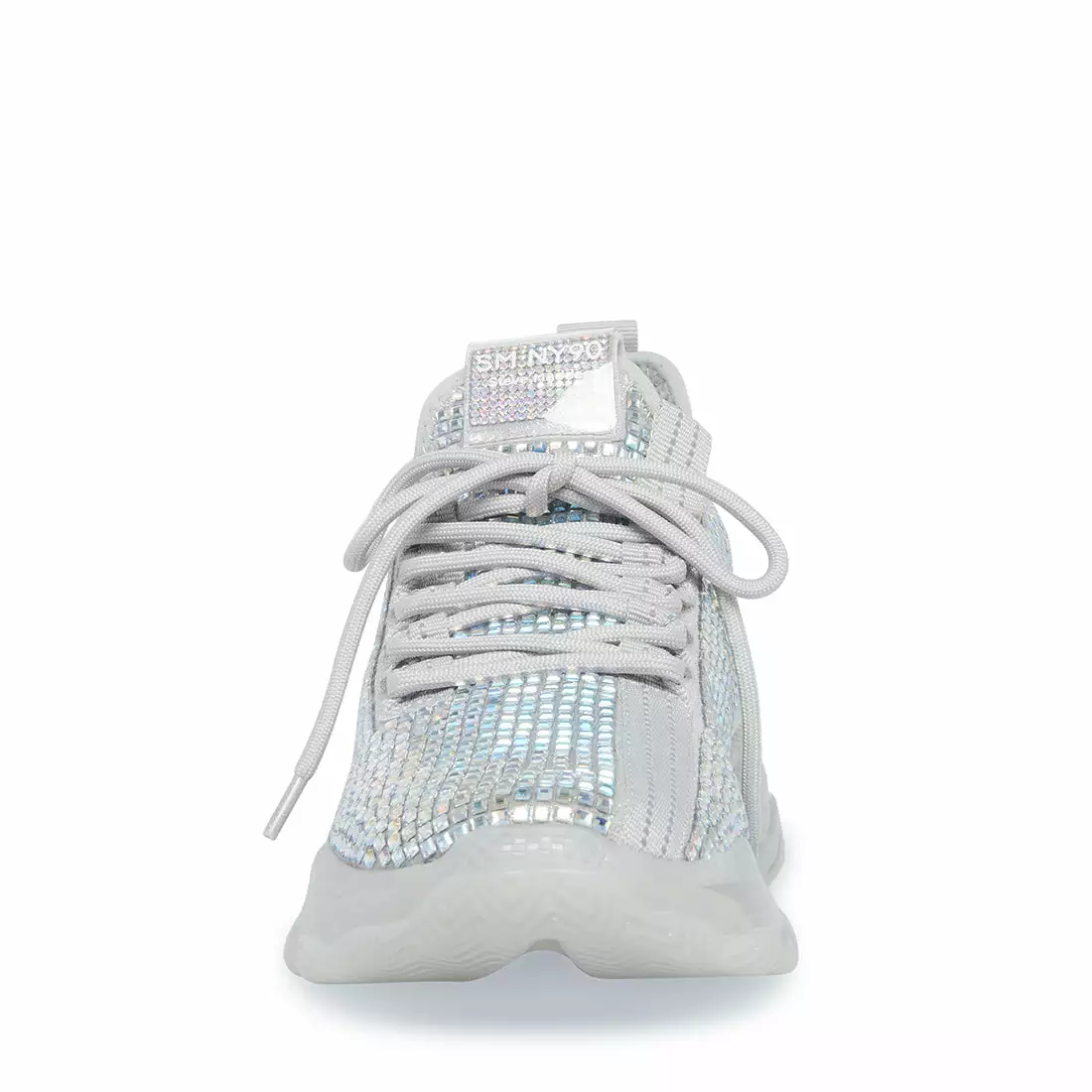 A super-sleek monochromatic color palette unites this kick’s trendy texture-blocked construction, which incorporates a knit upper, embossed strap detail, shiny sculpted sole and tastefully tonal rhinestone embellishment.