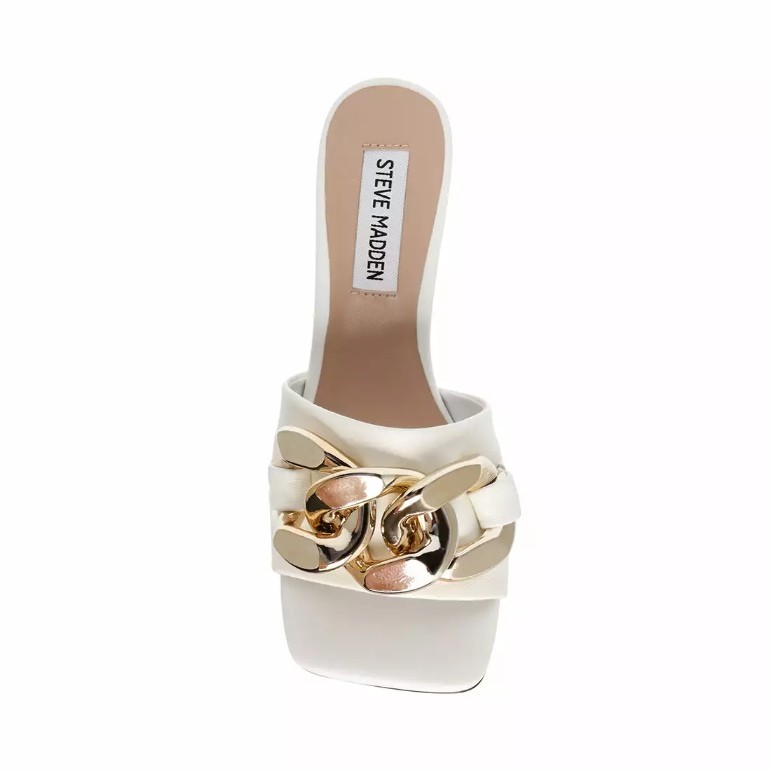 Trim your toes in statement chain! Oversized metal links dress up this sexy slide, while a just-high-enough heel lifts and flatters.ย